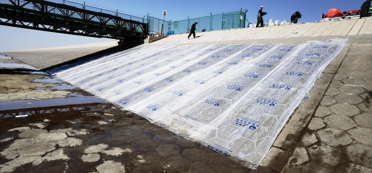 混凝土節水保濕養護膜,是以新型可控高分子吸水材料為核心,以塑料薄膜為載體,通過設備加工復合而成的卷材產品。其中高分子材料可吸收自重200倍的水分子, 吸水膨脹后變成透明的晶狀體,把液態水變成固態水,每平方米養護膜可蓄水0.5KG,成為一個固態的微型水庫,然后通過毛細管的作用向混凝土養護面滲透, 同時不斷吸收混凝土在水化過程中產生的蒸發水,因此在一個養護期內總能保持混凝土表面濕潤。